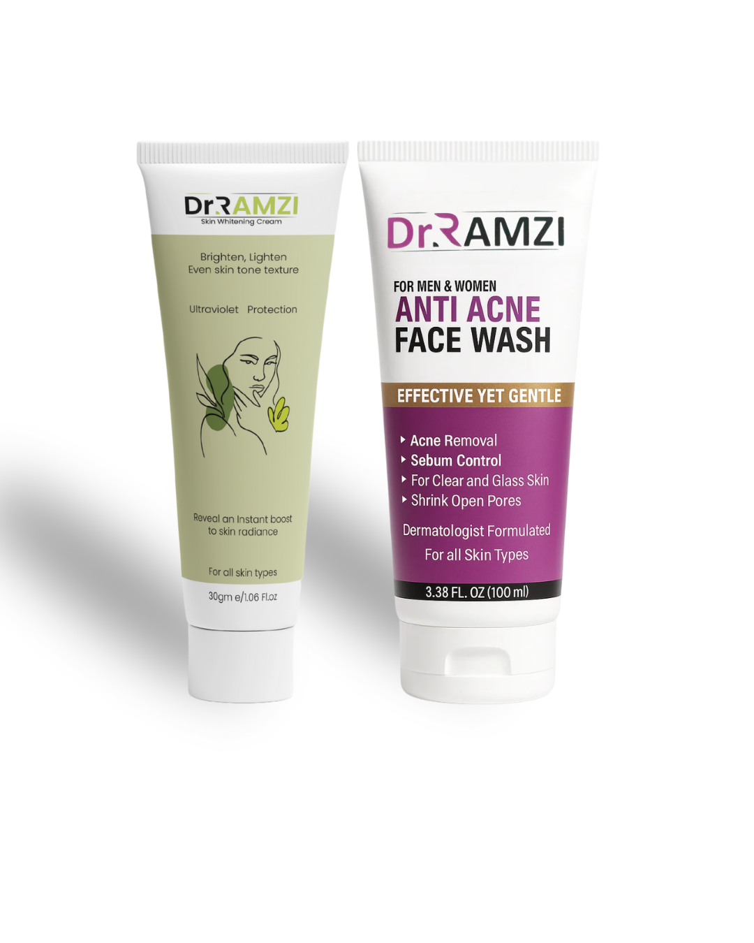 Dr. Ramzi's Clearity Kit combines an anti-acne face wash and a brightening cream to effectively target blemishes while enhancing skin radiance. The face wash helps cleanse impurities and reduce acne, promoting clearer skin. The brightening cream works to even skin tone and restore a natural glow. Together, these products provide a comprehensive skincare solution for a clearer, healthier complexion.
